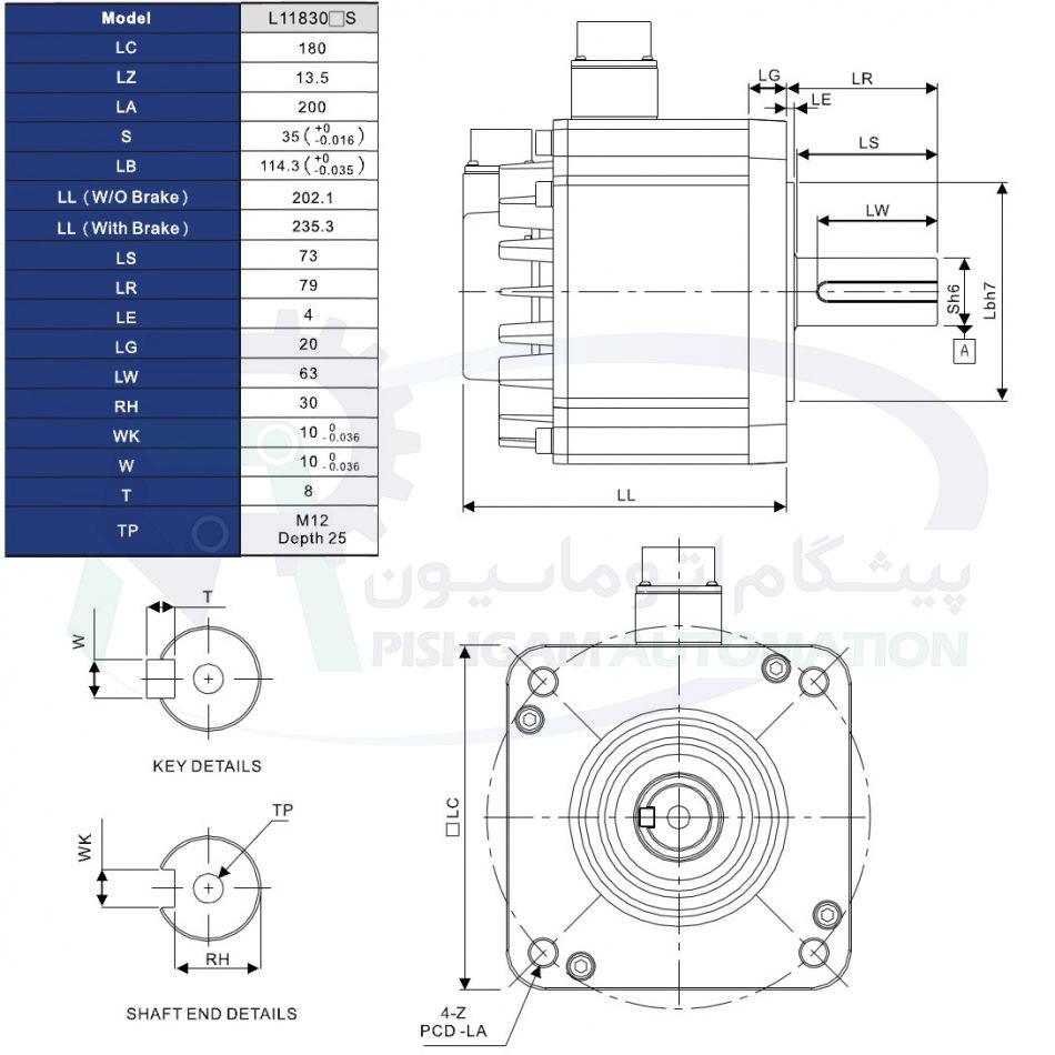 سروو موتور سه فاز 3 کیلو وات دلتا مدل A2 ترمزدار با سرعت نامی 1500RPM و گشتاور 19.1NM